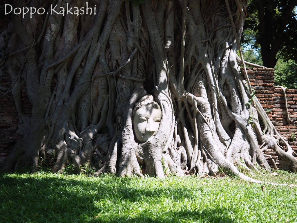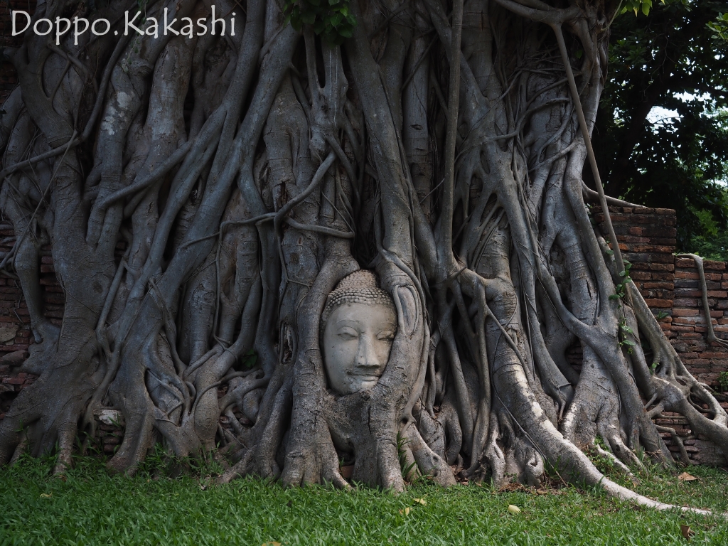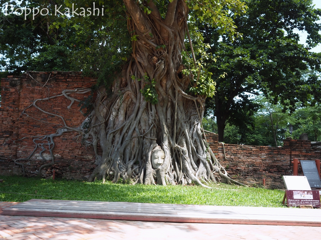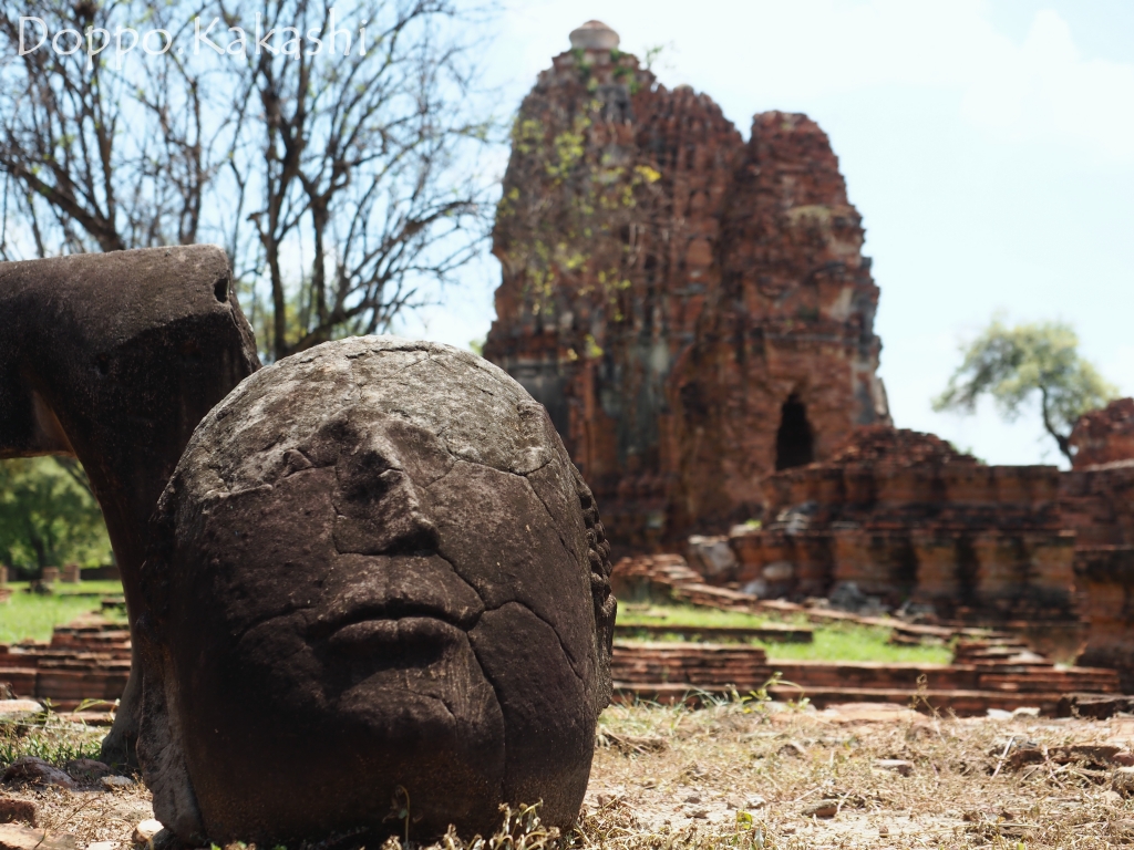 1600年中頃ここマハタート寺院において、戦争によりとある仏像の頭部は無残に切り取られ、身体を失った安らかなお顔が地面に落下してしまった