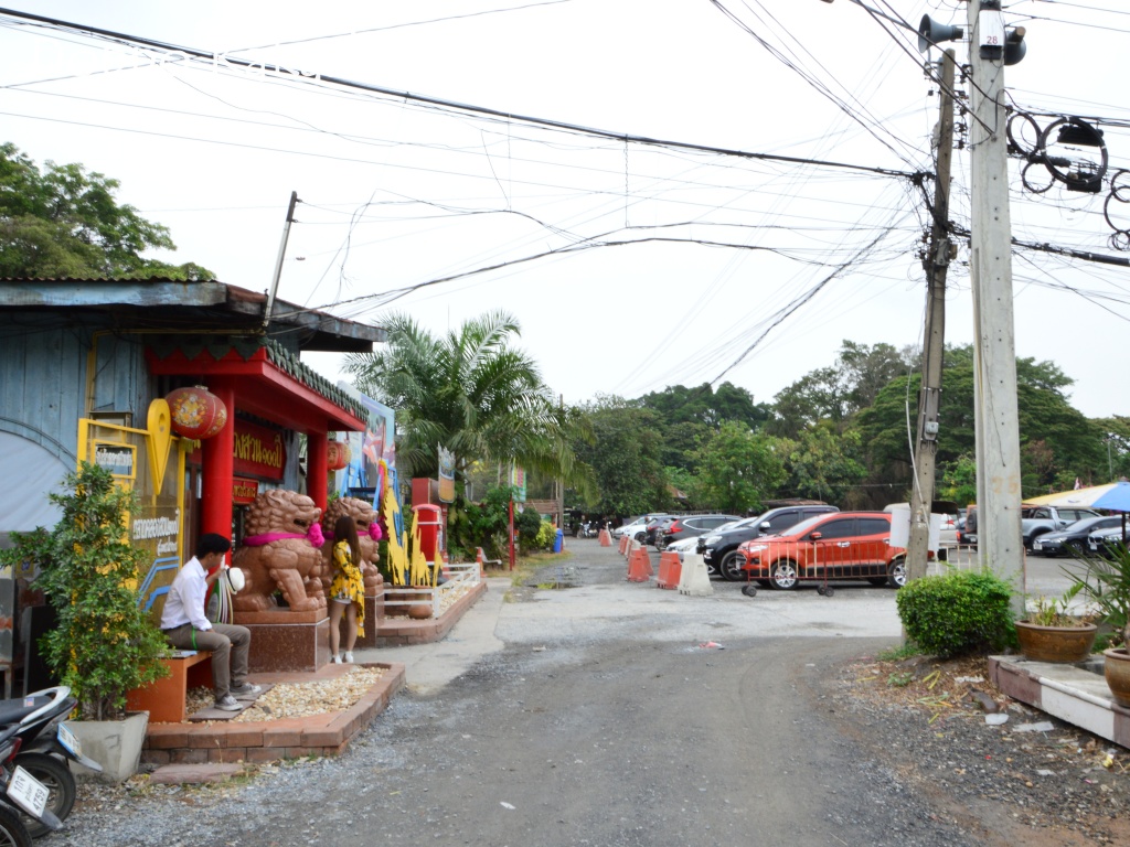 タイ語で百年と書かれた鳥居型入り口をくぐると、そこには大きな駐車場が現れる