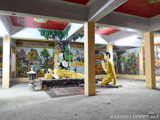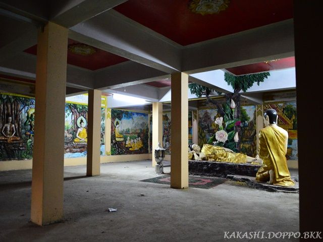 薄暗く写真が撮りづらいのだが壁一面によくある仏の一生が描かれており中心に涅槃像