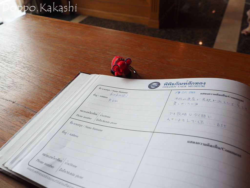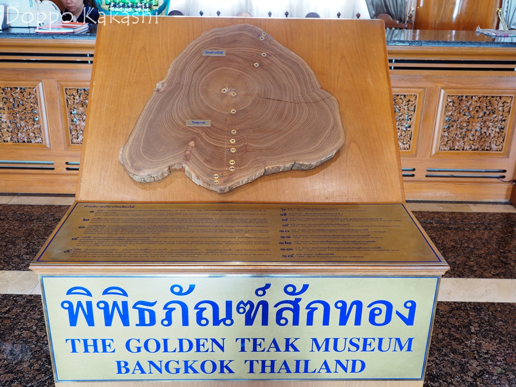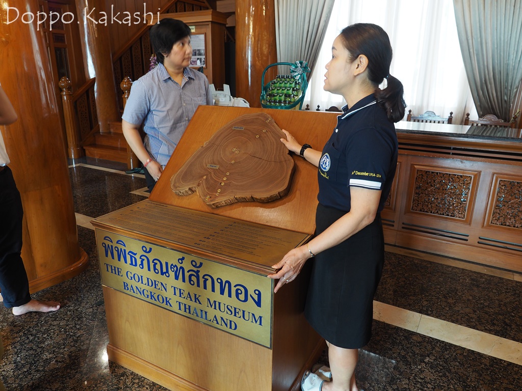 ここ黄金チーク博物館は長さ約30mの黄金色に輝くチーク材の柱を軸に建てられた建物で、この材木はおよそ500年弱前ほどの樹齢のものだという
