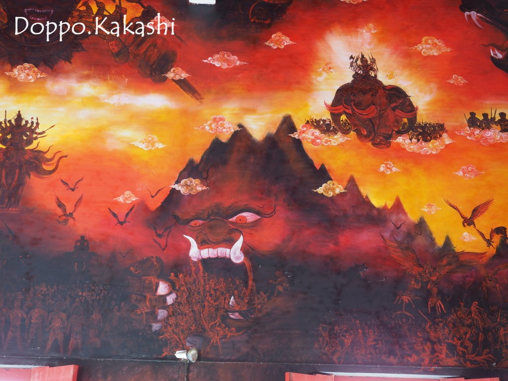 壁一面に業火で赤く染まった地獄世界が描かれている