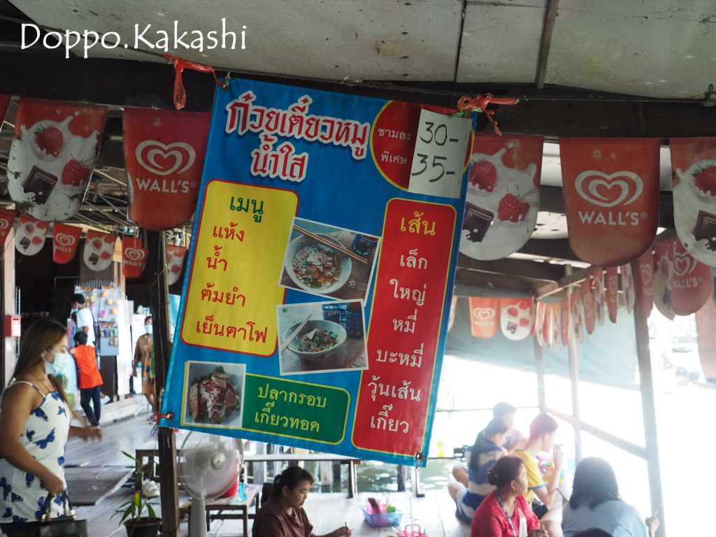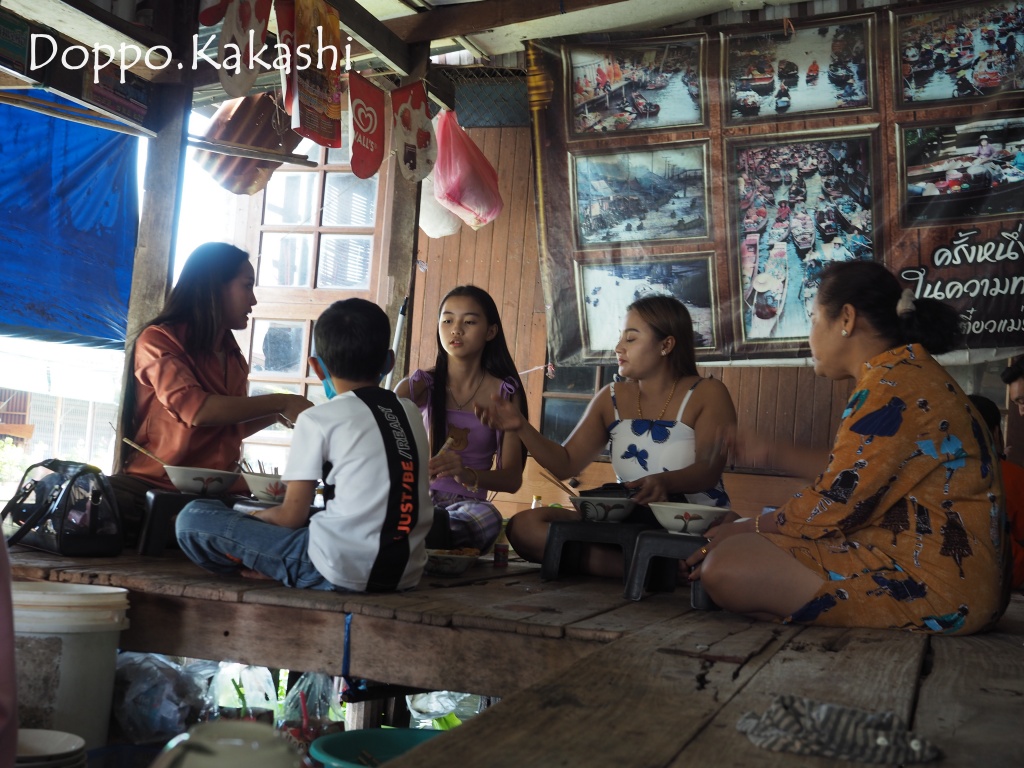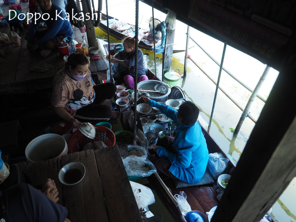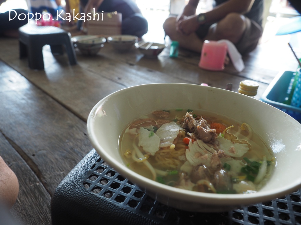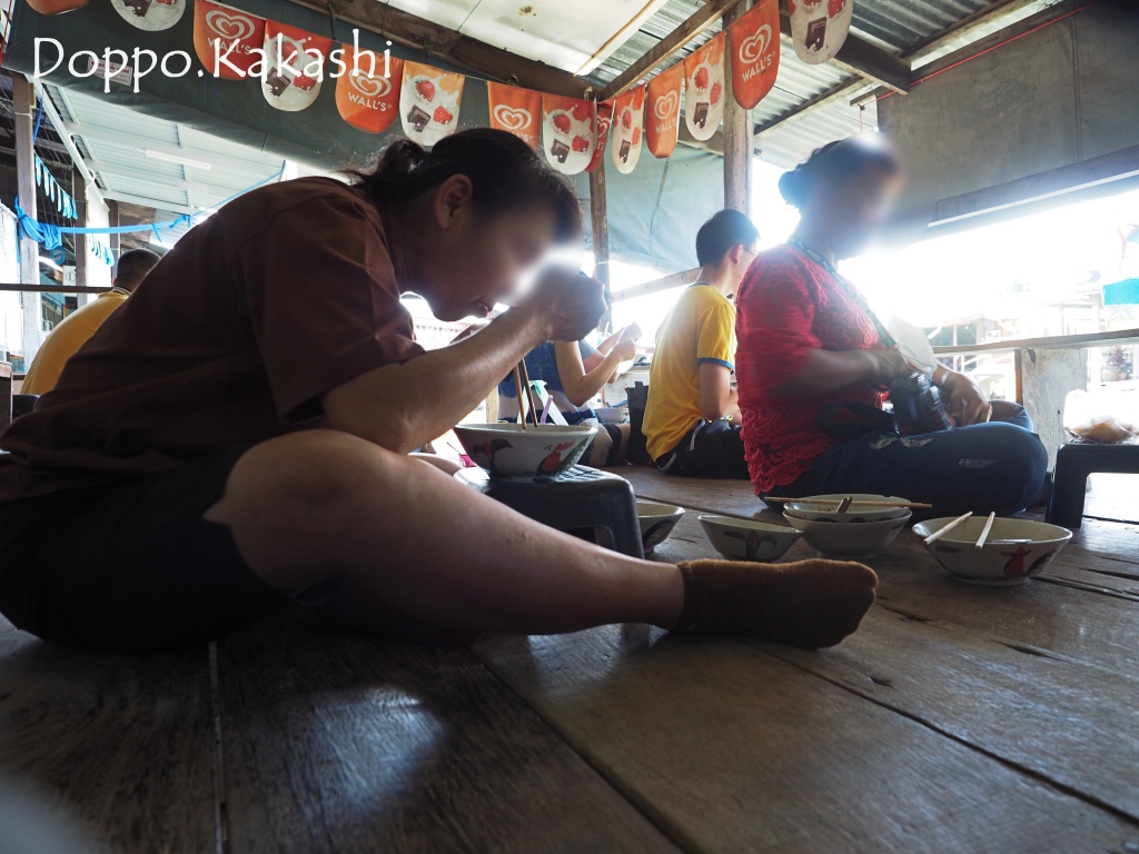 小舟の上より提供される1杯30THB (100円) のヌードルは、タイらしく地べたに座っていただくスタイル