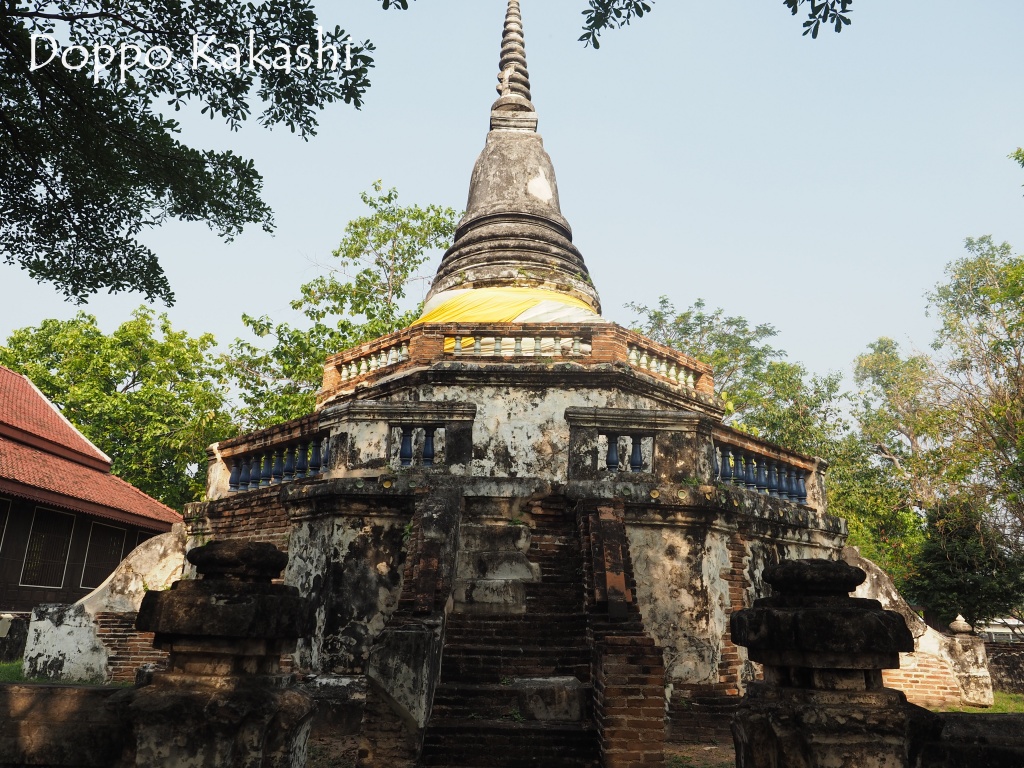 高さ約7mで四面に階段があしらわれた八角形土台の仏塔です